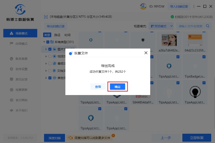 3. 系統(tǒng)正在進(jìn)行數(shù)據(jù)的掃描,這一過(guò)程無(wú)需手動(dòng)干預(yù),只需耐心等待掃描成功即可。掃描完成后,請(qǐng)選擇要恢復(fù)的文件,然后點(diǎn)擊“立即恢復(fù)”。