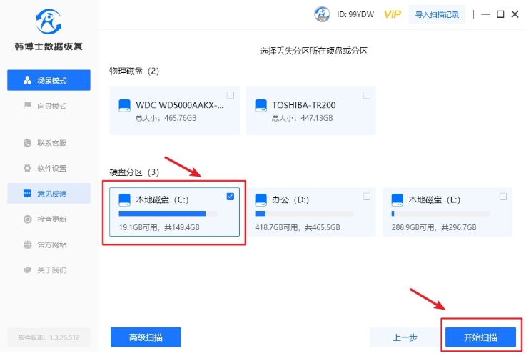 2. 明確需要恢復(fù)數(shù)據(jù)所在的分區(qū),確認(rèn)無(wú)誤后,點(diǎn)擊“開(kāi)始掃描”按鈕,開(kāi)始進(jìn)行數(shù)據(jù)掃描。