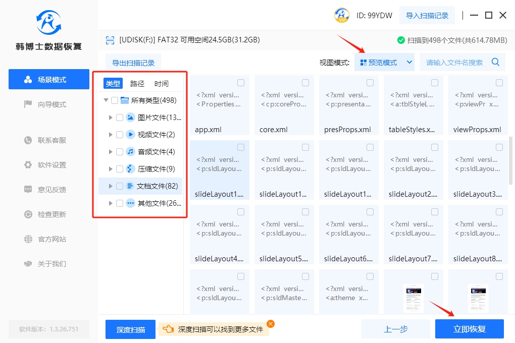 4. 完成掃描后,您可以先點(diǎn)擊“預(yù)覽模式”,確認(rèn)文件是否正確,然后選擇您想要恢復(fù)的數(shù)據(jù),最后再點(diǎn)擊“立即恢復(fù)”。