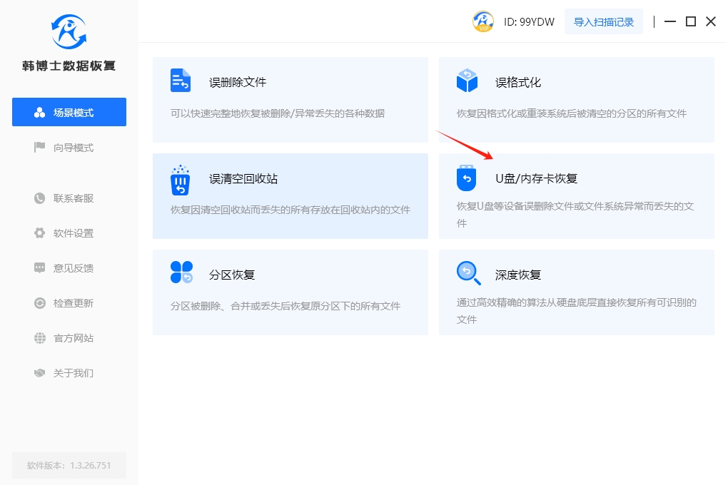 1. 先下載好韓博士數(shù)據(jù)恢復(fù)軟件到電腦桌面,然后雙擊啟動,點(diǎn)擊“場景模式”,選擇“U盤/內(nèi)存卡恢復(fù)”。