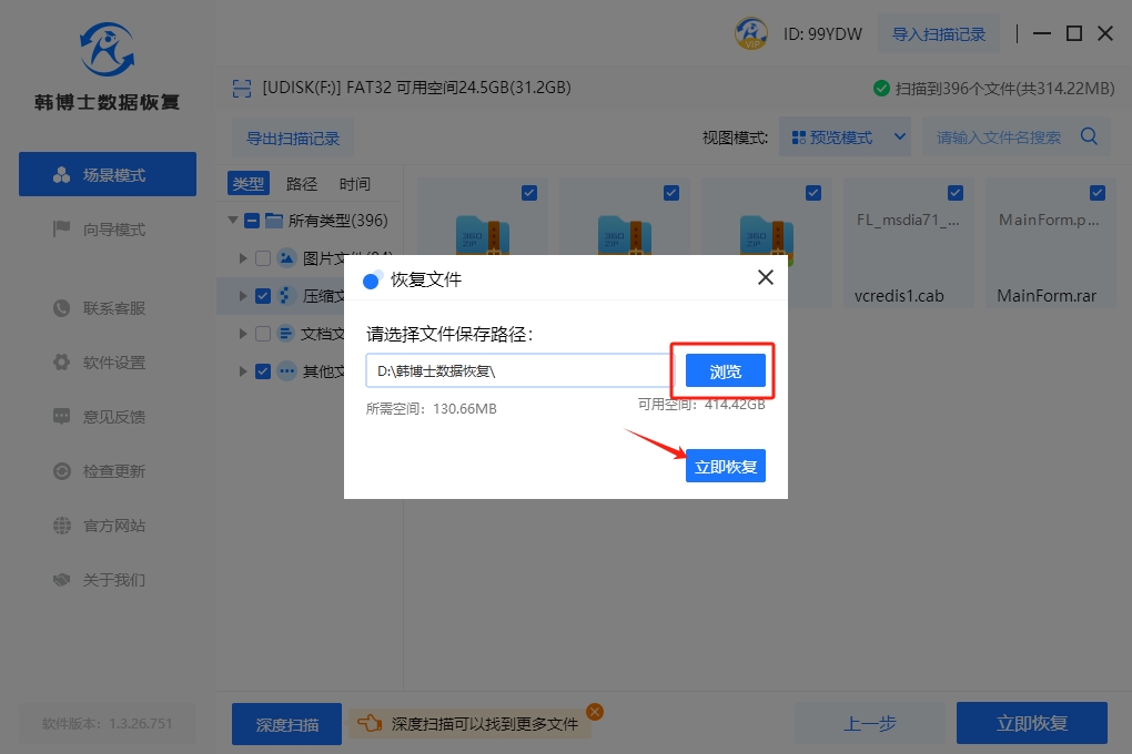 1. 開始恢復(fù)前,請先將韓博士數(shù)據(jù)恢復(fù)軟件下載到桌面,并雙擊打開。接著,在界面中找到“場景模式”,然后選擇“U盤/內(nèi)存卡恢復(fù)”。這樣,您就可以開始進行SD卡的數(shù)據(jù)恢復(fù)了。