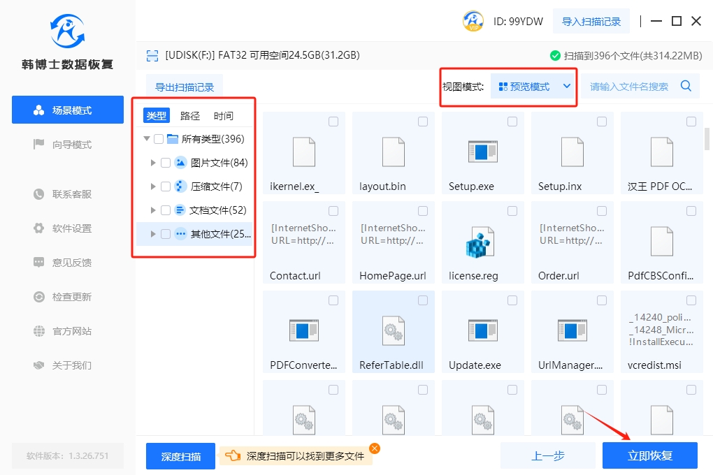 4. 掃描操作結(jié)束后,不要忘記點(diǎn)擊“預(yù)覽模式”,來檢查文件的準(zhǔn)確性。確認(rèn)文件正確無誤后,選中您想要恢復(fù)的文件,然后點(diǎn)擊“立即恢復(fù)”。