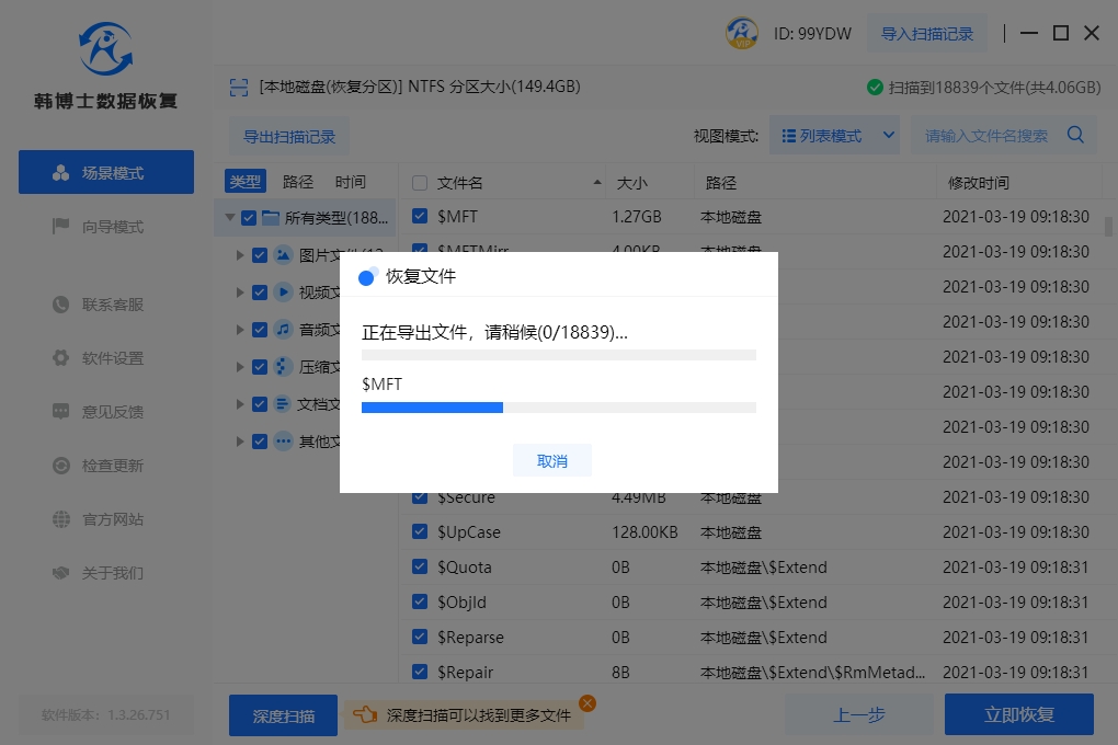 3. 韓博士進(jìn)行數(shù)據(jù)的掃描操作,這一過程無需您手動操作,只需等待掃描成功即可。掃描完成后,請選擇您需要恢復(fù)的文件,然后點擊“立即恢復(fù)”