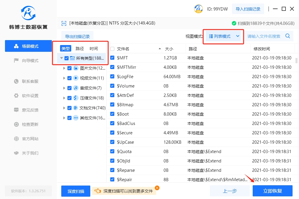 3. 文件掃描正在進行中,請稍等。掃描完成后,請仔細查看需要恢復(fù)的文件,然后勾選,再點擊"立即恢復(fù)",開始文件的恢復(fù)。
