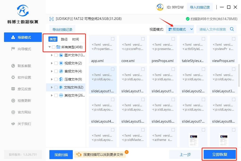 4. 完成掃描后,您可以先點擊“預覽模式”,確認文件是否正確,然后選擇您想要恢復的數(shù)據(jù),最后再點擊“立即恢復”。