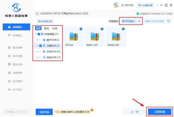 4. 掃描完成后,可立即使用“預覽模式”,來確認文件是否正確無誤。確認好之后,再勾選需要恢復的文件,然后點擊“立即恢復”。
