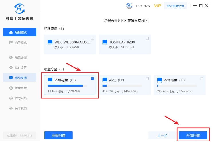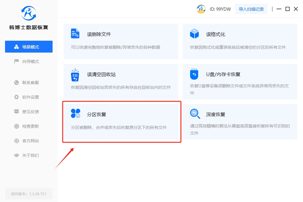 1. 在進(jìn)行數(shù)據(jù)恢復(fù)之前,請確保您的計(jì)算機(jī)上已經(jīng)安裝了韓博士數(shù)據(jù)恢復(fù)軟件。接著雙擊啟動(dòng)韓博士,在“場景模式”下選擇“分區(qū)恢復(fù)”,來進(jìn)行硬盤數(shù)據(jù)恢復(fù)。