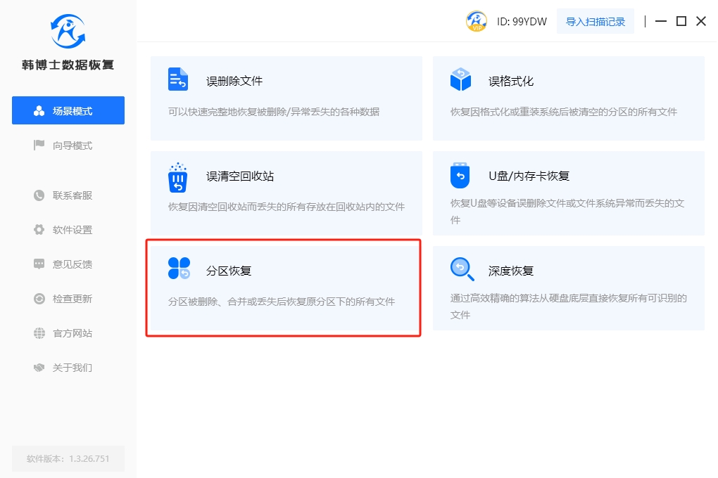 1. 在進(jìn)行數(shù)據(jù)恢復(fù)之前,請確保您的計(jì)算機(jī)上已經(jīng)安裝了韓博士數(shù)據(jù)恢復(fù)軟件。接著雙擊啟動韓博士,在“場景模式”下選擇“分區(qū)恢復(fù)”,來進(jìn)行硬盤數(shù)據(jù)恢復(fù)。
