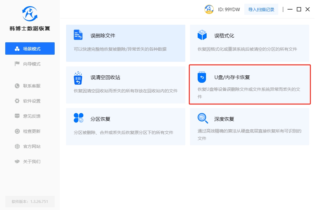 1. 首先打開桌面上的韓博士數(shù)據(jù)恢復(fù)軟件,然后點(diǎn)擊“場(chǎng)景模式”,選擇“U盤/內(nèi)存卡恢復(fù)”,恢復(fù)過程即將開始。
