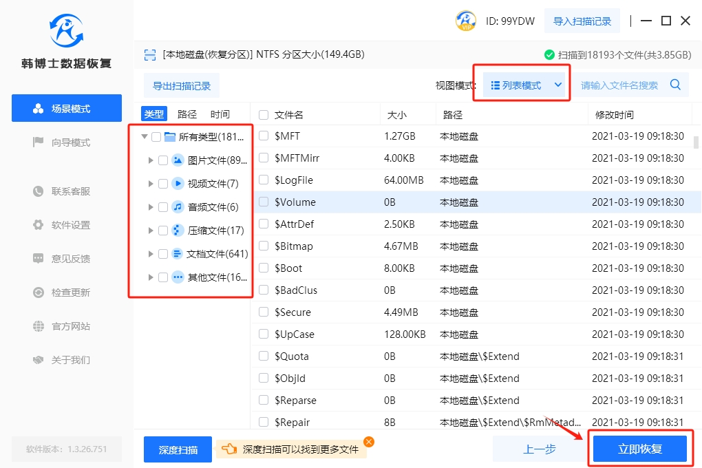 3.文件掃描正在進行中,請稍等。掃描完成后,請仔細查看需要恢復(fù)的文件,然后勾選,再點擊"立即恢復(fù)",開始文件的恢復(fù)。