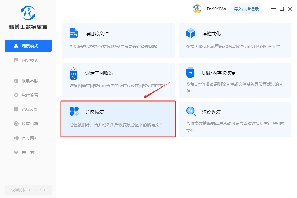 1. 下載并在計(jì)算機(jī)上安裝好韓博士數(shù)據(jù)恢復(fù),之后選擇“場(chǎng)景模式”下的“分區(qū)恢復(fù)”,再繼續(xù)下一步的恢復(fù)操作。