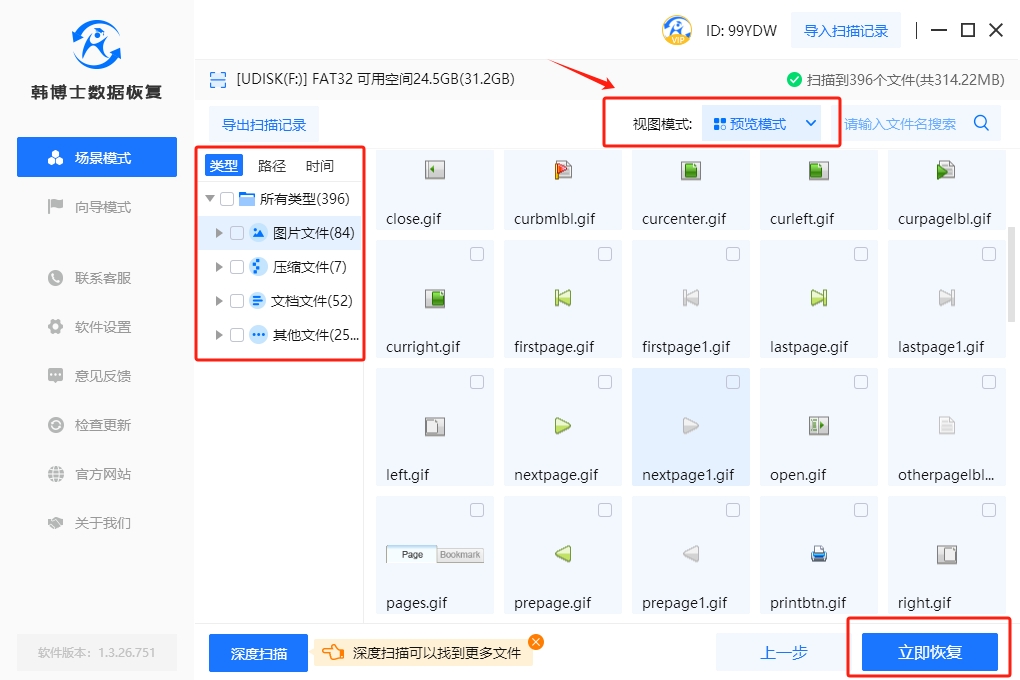 4. 掃描完成后,可立即使用“預覽模式”,來確認文件是否正確無誤。確認好之后,再勾選需要恢復的文件,然后點擊“立即恢復”。