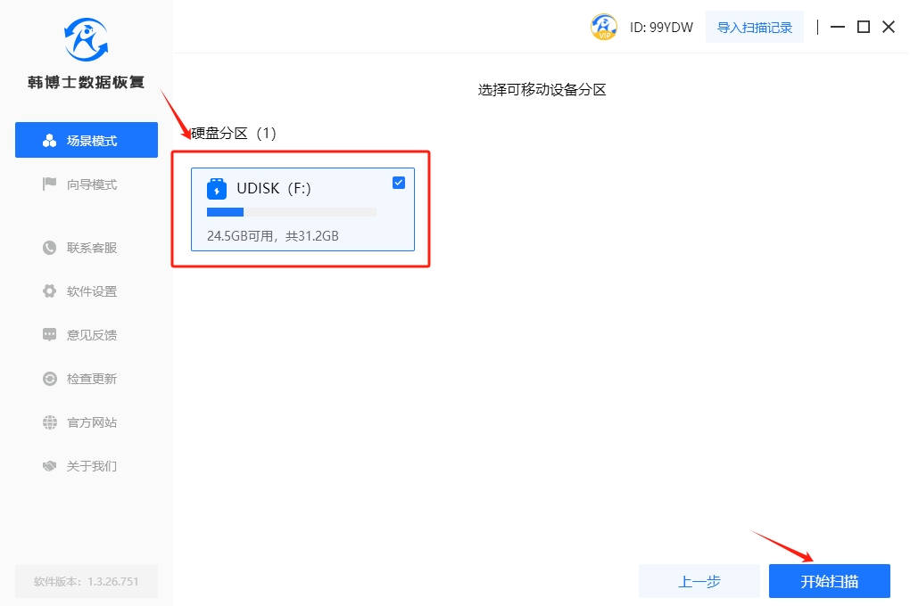 1. 首先,雙擊打開(kāi)桌面上下載好的韓博士數(shù)據(jù)恢復(fù)。然后,您需要在軟件界面中找到“場(chǎng)景模式”,并選擇其中的“U盤/內(nèi)存卡恢復(fù)”選項(xiàng)。這樣,您就可以順利進(jìn)入文件恢復(fù)的流程了。