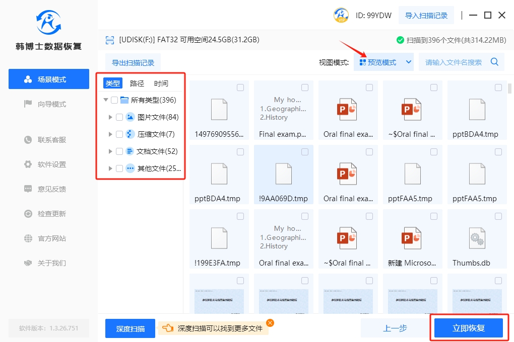 4. 數(shù)據(jù)掃描好了之后,馬上用“預(yù)覽模式”來(lái)檢查文件是否正確。然后,選中您想要恢復(fù)的文件,點(diǎn)擊“立即恢復(fù)”,開(kāi)始數(shù)據(jù)的恢復(fù)流程。