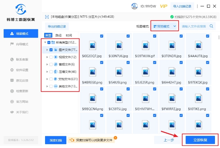 3. 系統(tǒng)正在進(jìn)行數(shù)據(jù)的掃描,這一過程無需手動(dòng)干預(yù),只需耐心等待掃描成功即可。掃描完成后,請(qǐng)選擇要恢復(fù)的文件,然后點(diǎn)擊“立即恢復(fù)”。