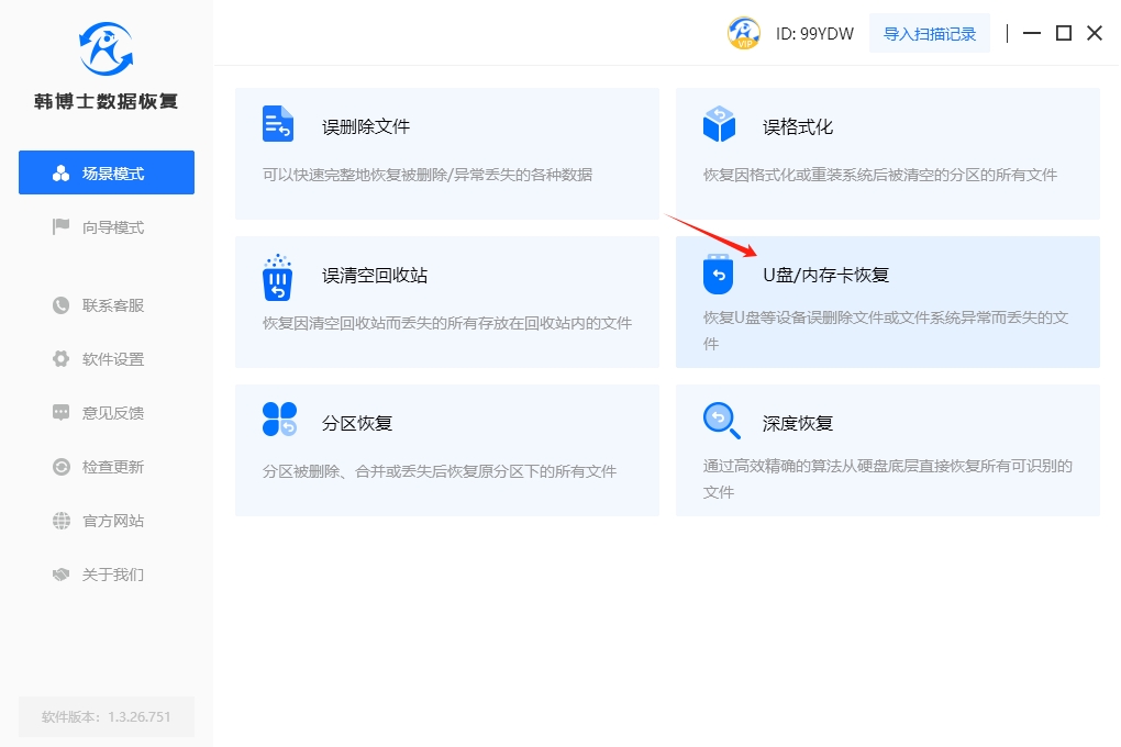 1.打開桌面上的韓博士數(shù)據(jù)恢復(fù)軟件,點(diǎn)擊“場景模式”,并選擇“U盤/內(nèi)存卡恢復(fù)”,以開始相應(yīng)的數(shù)據(jù)恢復(fù)流程。
