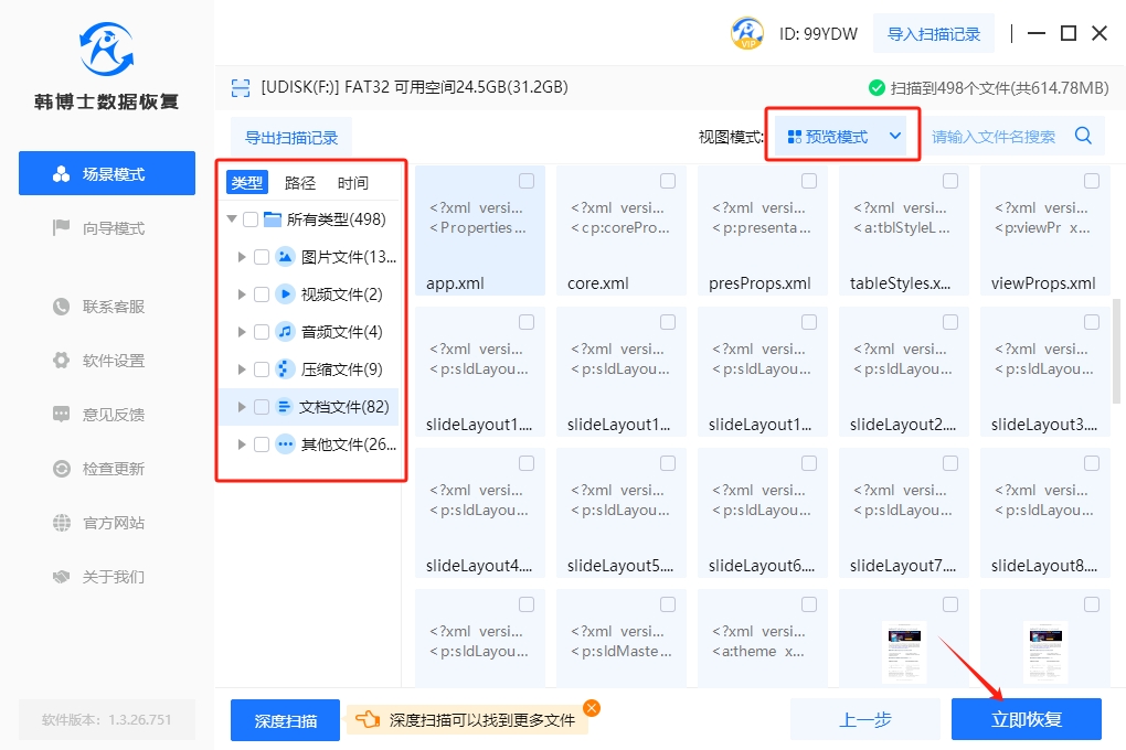 4. 掃描操作結(jié)束后,您可點(diǎn)選“預(yù)覽模式”,檢視文件的正確性,然后選出自己需要恢復(fù)的文件,最后點(diǎn)擊“立即恢復(fù)”按鈕即可。