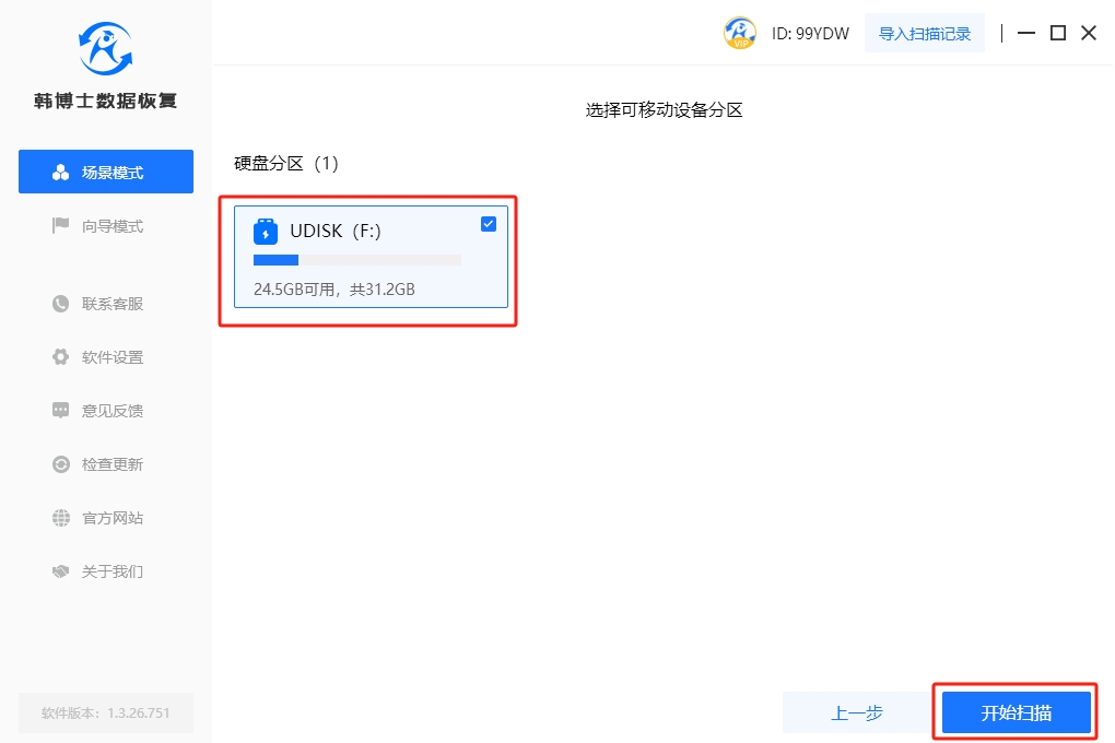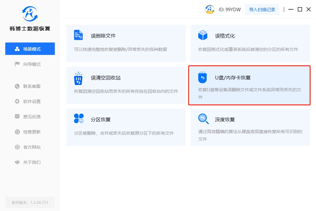 1. 打開(kāi)韓博士數(shù)據(jù)恢復(fù)軟件,這是內(nèi)存卡數(shù)據(jù)恢復(fù)的必要步驟。然后,在軟件界面中找到“場(chǎng)景模式”,點(diǎn)擊“U盤(pán)/內(nèi)存卡恢復(fù)”。