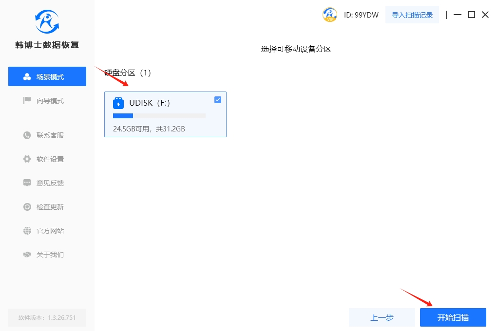 1. 要執(zhí)行數(shù)據(jù)恢復操作,首先雙擊打開韓博士,進入軟件界面,然后找到“場景模式”,選擇“U盤/內存卡恢復”。