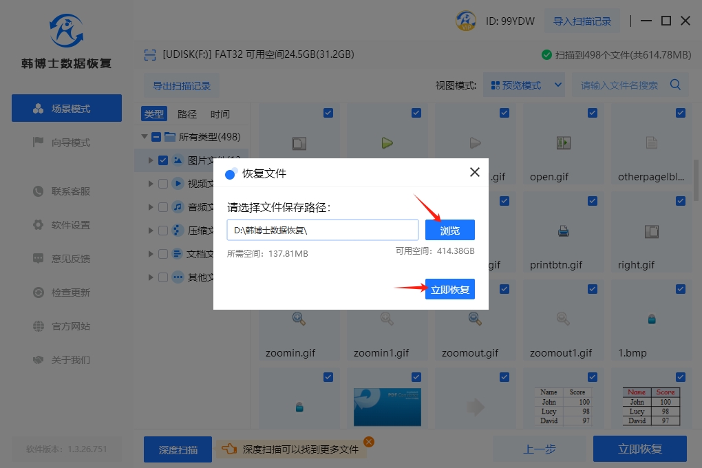 4. 掃描完成后,您可以通過“預覽模式”來確認文件是否正確,接下來選擇需要恢復的文件,選好后再點擊“立即恢復”。