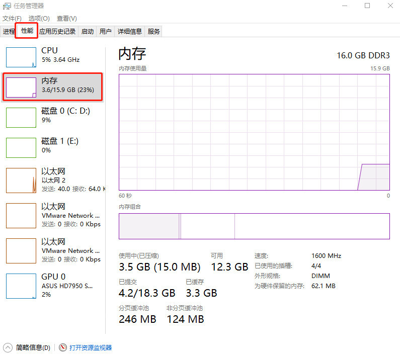 2.在打開(kāi)的界面中將鼠標(biāo)切換至“性能”,隨后在內(nèi)存中就可以查看到了。