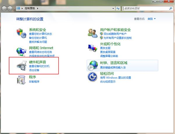 1.打開電腦上的控制面板,直接選擇“硬件和聲音”中的“設備和打印機”進入。