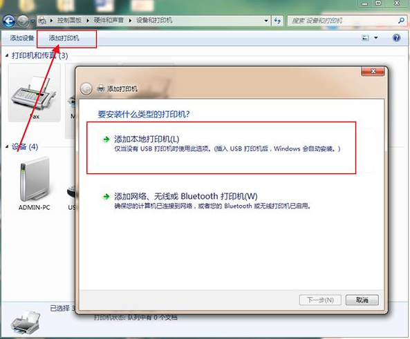 2.開始點擊左上角進行“添加打印機”,在彈出的窗口中點擊“添加本地打印機”進入,當然要記得先使用usb數(shù)據(jù)線將電腦和打印機連接起來。