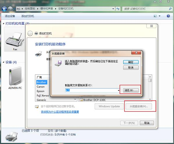 5.當然如果大家找不到對應的廠商和型號,直接選擇從磁盤上安裝,插入usb后就可以看到電腦已經(jīng)自動安裝了打印機,最后點擊“瀏覽”選擇打印機的驅(qū)動。