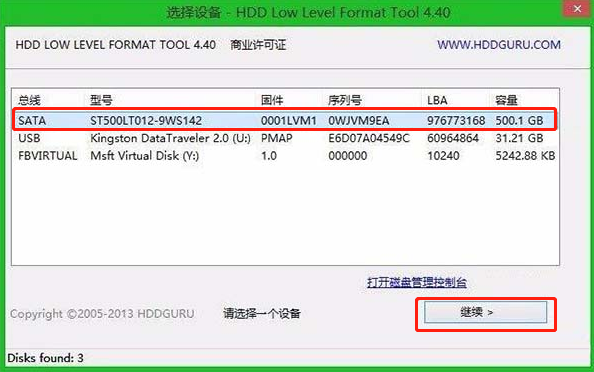1.將需要低格的硬盤(pán)連接至電腦,進(jìn)入PE系統(tǒng)后打開(kāi)低格工具(如hdd low level format tool工具),選擇需要低格的硬盤(pán)“繼續(xù)”操作。