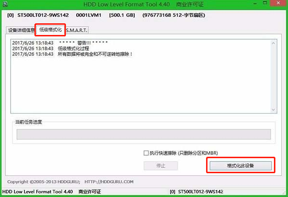 2.在彈出的界面中將鼠標(biāo)切換至“低級(jí)格式化”選項(xiàng),開(kāi)始“格式化此設(shè)備”。