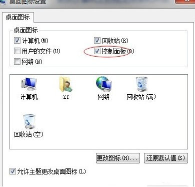 3.在彈出的對話框中勾選想要顯示的桌面圖標(biāo),默認(rèn)有計算機(jī)跟回收站。