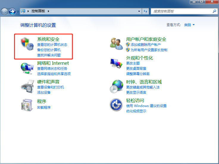 1.打開win7系統(tǒng)中的控制面板界面,直接選擇“系統(tǒng)和安全”選項(xiàng)進(jìn)入。