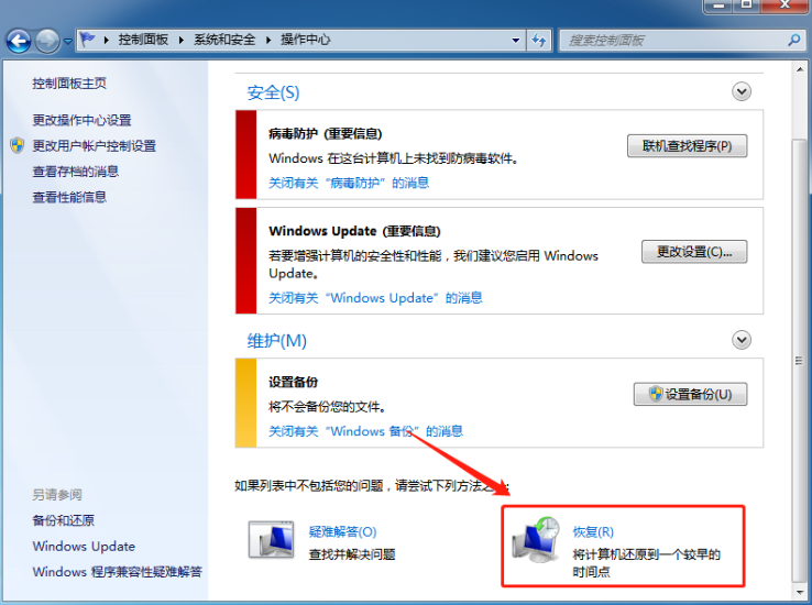 3.打開操作中心界面后,直接點(diǎn)擊右下角處“恢復(fù)”進(jìn)入操作。
