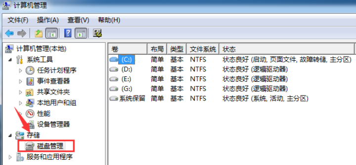 1.打開計算機管理界面,選擇磁盤管理進入。
