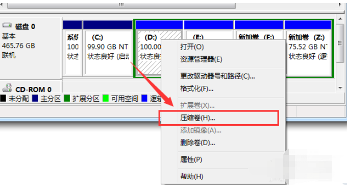 2.右鍵選中需要分區(qū)的磁盤,最后進行壓縮卷。