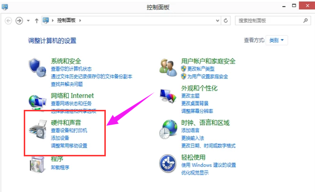 1.打開(kāi)控制面板,直接在界面中選擇硬件和聲音進(jìn)入。
