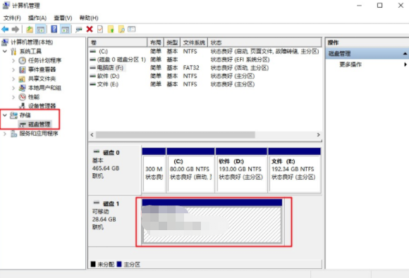 1.打開計(jì)算機(jī)管理界面,選擇磁盤管理進(jìn)入,找到其中的U盤。