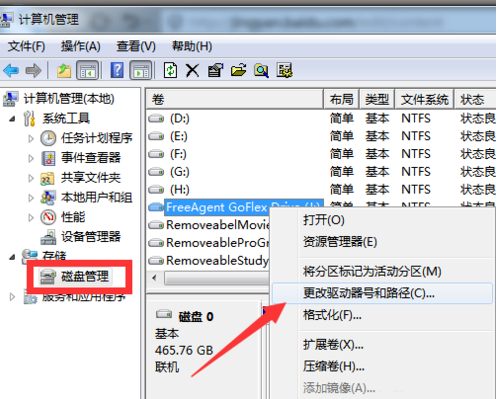 2.隨后打開磁盤管理,右鍵選中移動(dòng)設(shè)備,開始進(jìn)行更改驅(qū)動(dòng)器號和路徑。