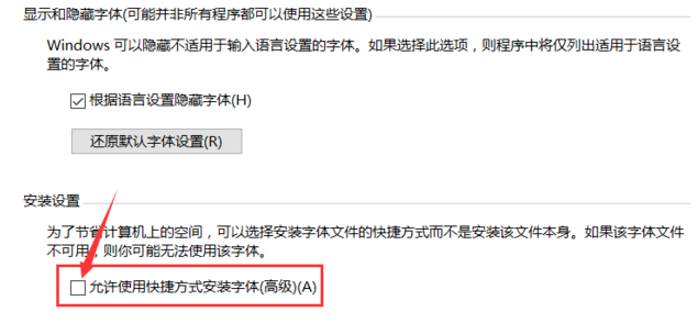 6.勾選界面下方的“允許使用快捷方式安裝字體(高級(jí))(A)”。