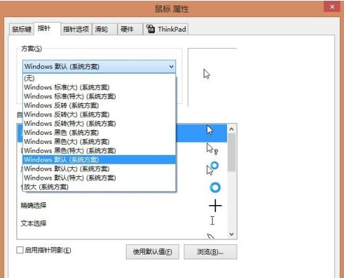 3.彈出“鼠標(biāo)屬性”,點(diǎn)擊“方案”下拉框,調(diào)整鼠標(biāo)的大小、方向等屬性。
