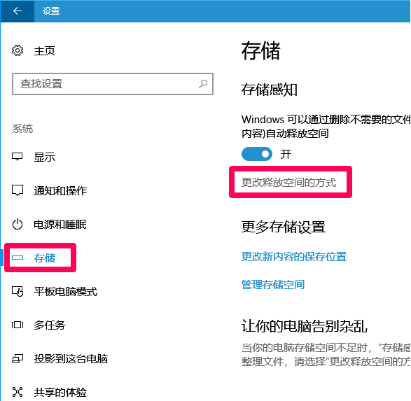 3. 點(diǎn)擊左側(cè)的【存儲(chǔ)】,在對(duì)應(yīng)右側(cè)窗口中點(diǎn)擊【更改釋放空間的方式】。