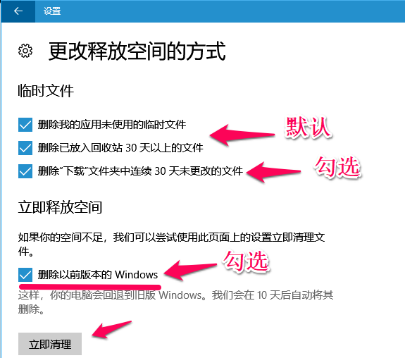 勾選:“刪除“下載”文件中連續(xù)30天未更改的文件”、“刪除以前版本的Windows”。最后點(diǎn)擊“立即清理”。