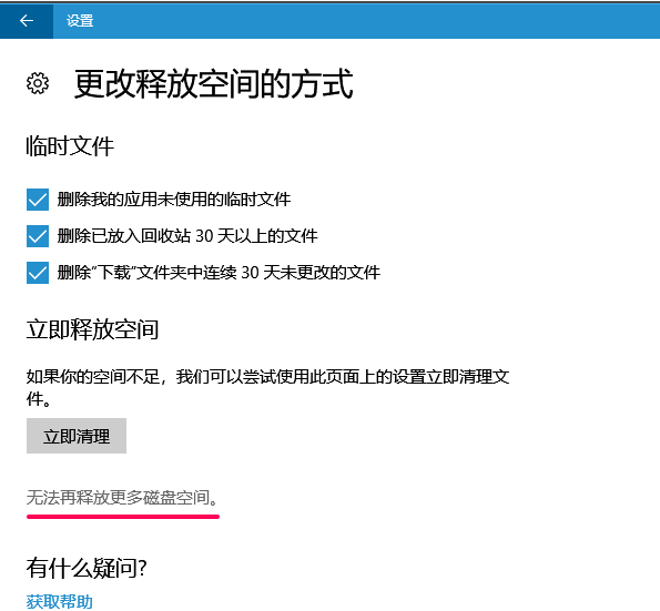 6. 系統(tǒng)文件清理完成。(再一次點(diǎn)擊【立即清理】,則會(huì)顯示:無法再釋放更多硬盤空間。)