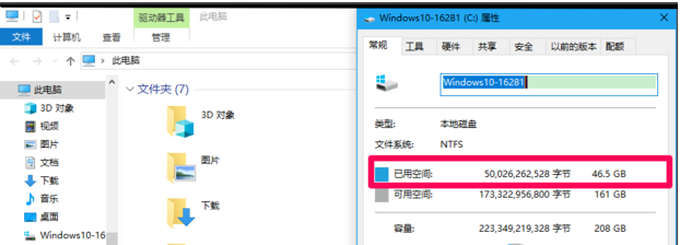 7. 進(jìn)入資源管理器,右鍵點(diǎn)擊系統(tǒng)磁盤 - 屬性,可以看到已用空間為:46.5GB,已經(jīng)清除了系統(tǒng)文件20GB左右。