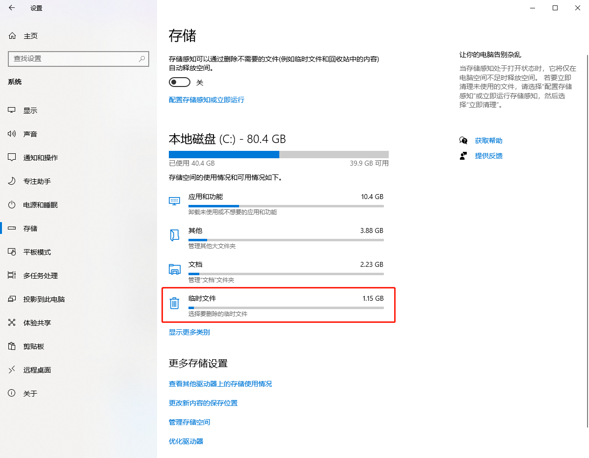 3.將“存儲”下的“臨時文件”進(jìn)行刪除即可。