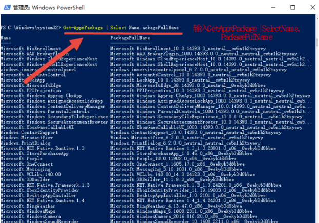 3.在打開的PowerShell窗口中,輸入“Get-AppxPackage | Select Name, PackageFullName”(注意空格和英文標點),查看已安裝應用的清單。