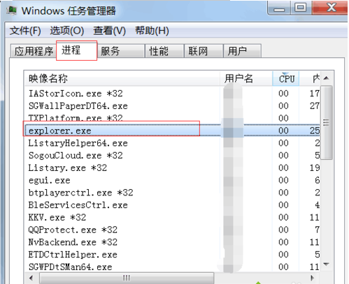 2.在“進(jìn)程”選項(xiàng)卡中找到“explorer.exe”進(jìn)程。