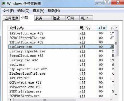3.選中“explorer.exe”點(diǎn)擊下方的“結(jié)束進(jìn)程”按鈕,關(guān)閉資源管理器。