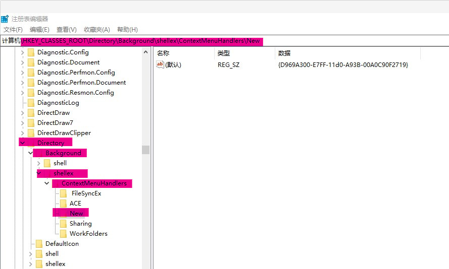 3.按照“HKEY_CLASSES_ROOT/Directory/Background/shellex/ContextMenuHandlers”的順序找到ContextMenuHandlers所在位置。