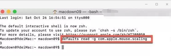 defaults read -g com.apple.mouse.scaling?。